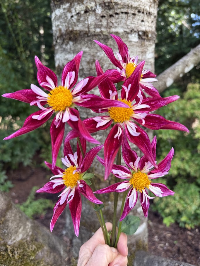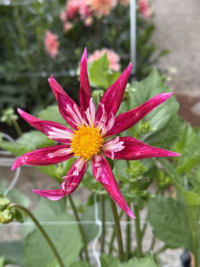 Bloomquist Exotic is a vivid pink dahlia measuring 5" to 6" with an orchette bloom shape, characterized by lighter petaloids and striking pointed ray petals. This variety was introduced in 2024 by the local hybridizer Paul Bloomquist.