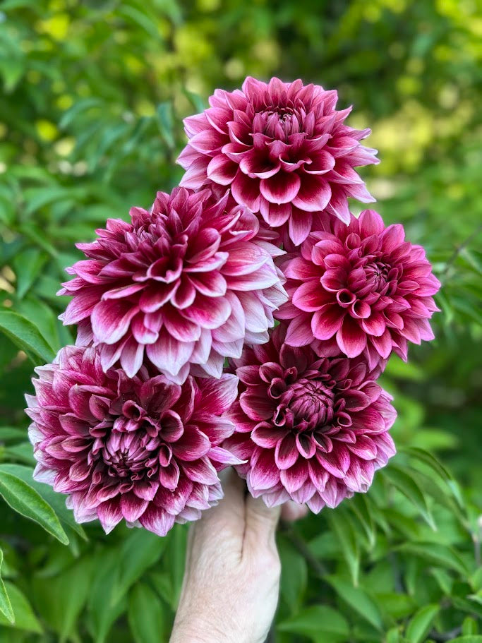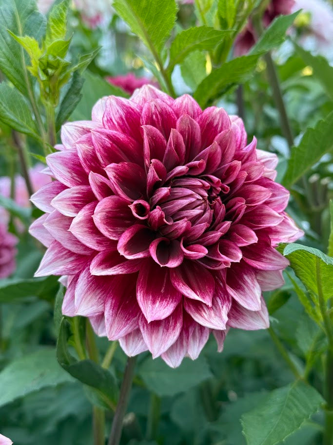 Bloomquist York is an exceptional 6-inch informal decorative dahlia showcasing a rare blend of deep wine red at its center that gradually fades to dusty rose at the petal tips. Its richly saturated rusty-red ombre petals combined with a deep chocolate core create a striking, hand-painted effect.