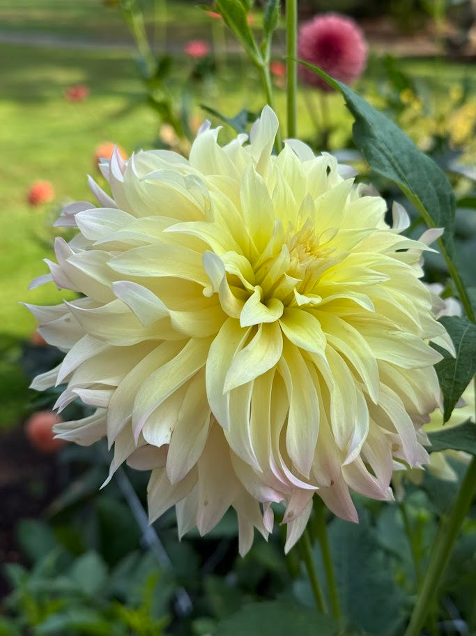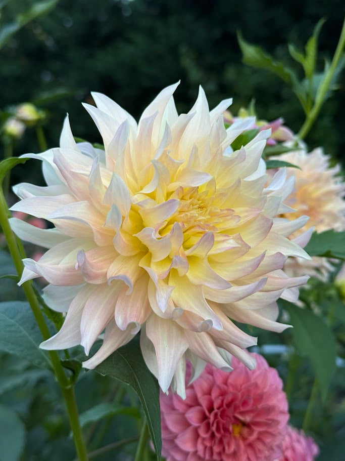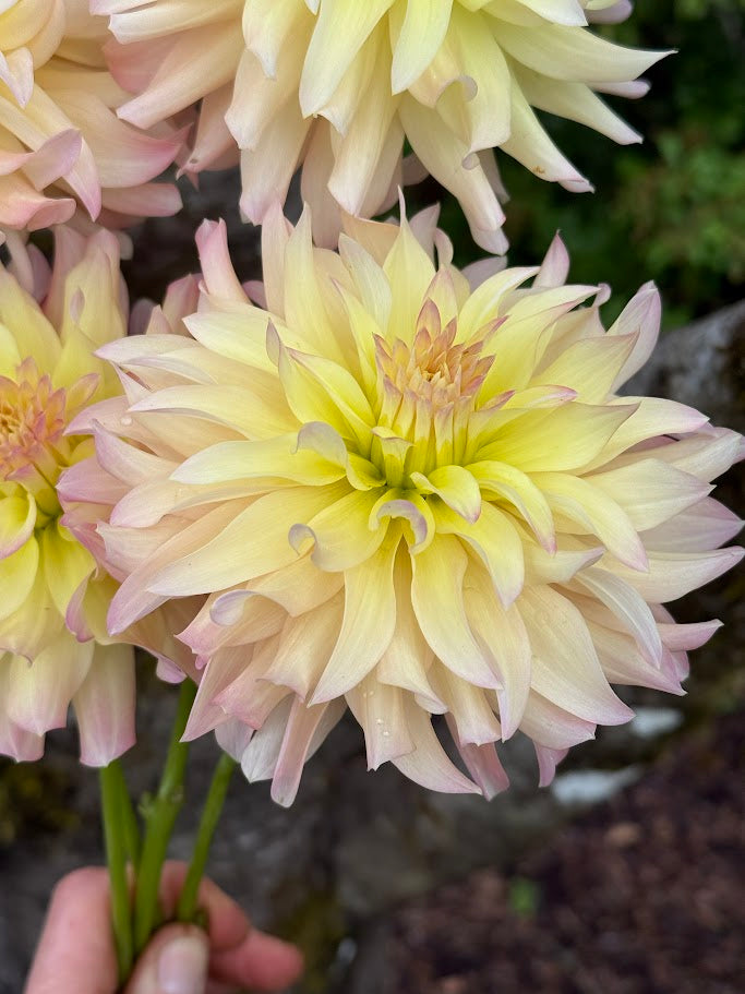 Lakeview Blush showcases delicate petals in soft lemon-chiffon with blushed pink tips, creating an elegant two-tone effect. This variety excels in wedding arrangements and professional floral design. 5" pale bloom with lots of twisty blush petals on 5' plant with strong stems.