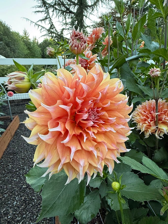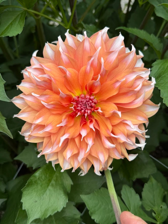 Lee's Arabesque delivers striking bicolor blooms in vibrant orange and white, with an elegant twirling form that commands attention. These 4-5" flowers emerge early on compact 2.5-3' plants, yet feature impressively long, sturdy dark stems ideal for cutting arrangements. A 2023 introduction that combines the best of ornamental garden presence with practical cut-flower performance.