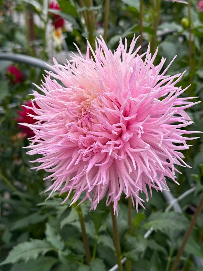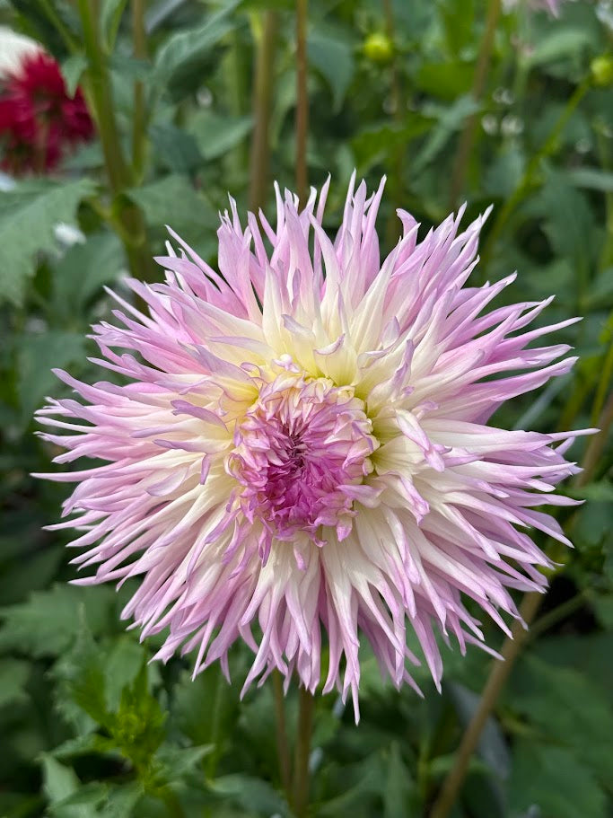 Mingus Leroy T, a stunning fimbriated dahlia that captivates with its ethereal beauty. This 4–6" bloom emerges in soft lavender tones, gradually transitioning to lighter hues as petals unfurl, often revealing delicate cotton candy pink undertones. The deeply divided petals create an intricate, feathered appearance with remarkable textural depth. Its airy, lace-like form moves gracefully with the slightest breeze.