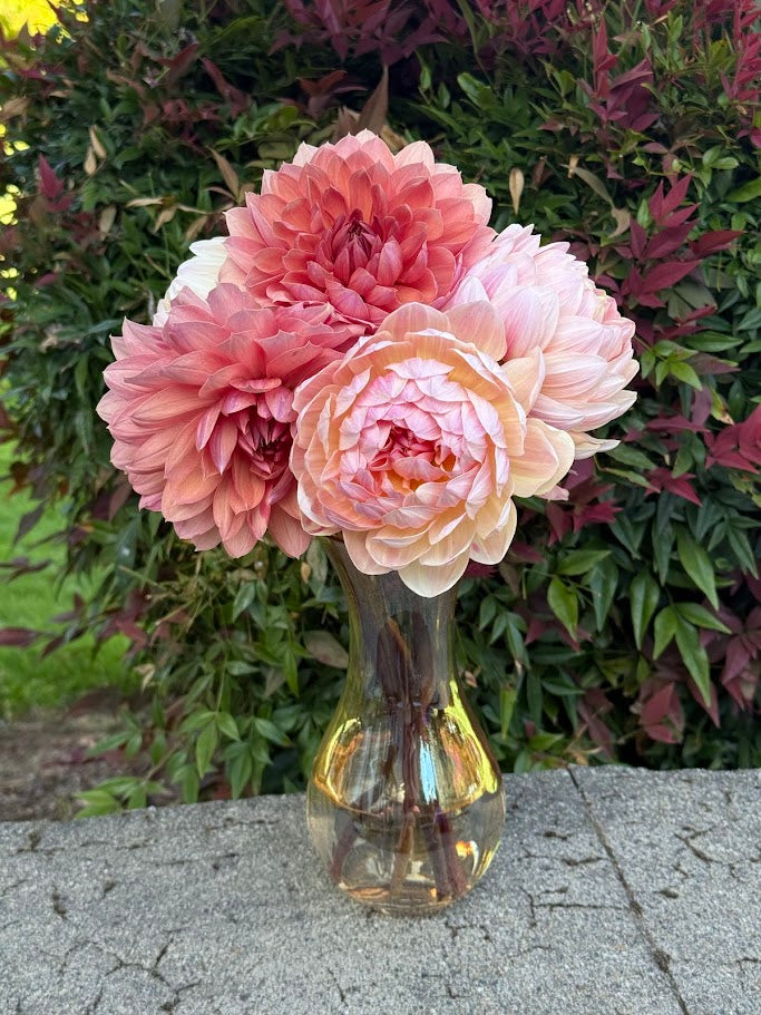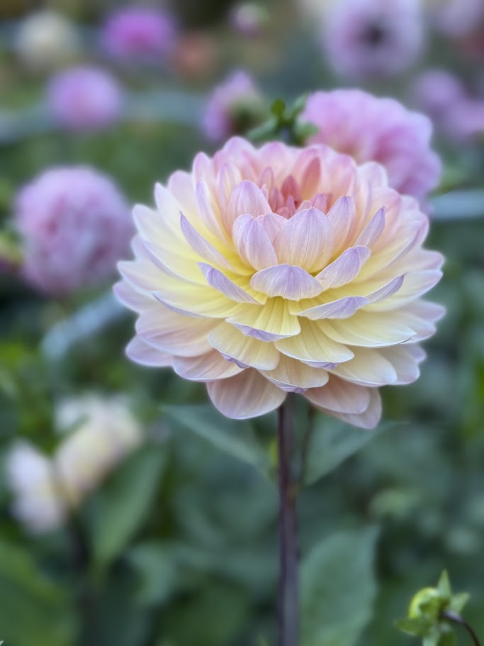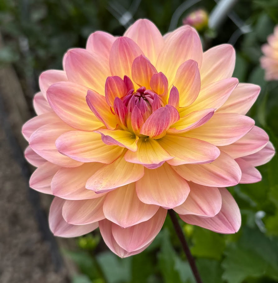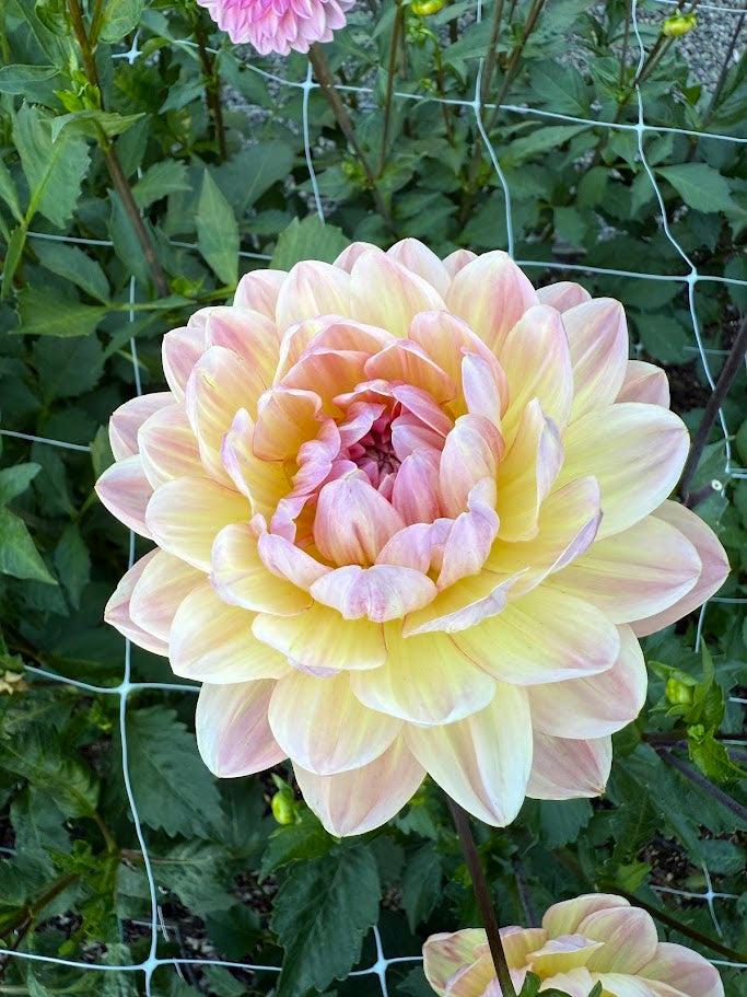 Dahlia 'Sandia Bliss' is an elegant waterlily-type dahlia, celebrated for its blissful blend of soft pink and creamy, light yellow tones. Its gracefully ruffled petals provide an ethereal, artistic touch, famously cupping inward as evening settles. A prolific bloomer with long, strong stems, this variety produces beautiful 4 to 5-inch flowers on plants that reach 40 to 48 inches tall.