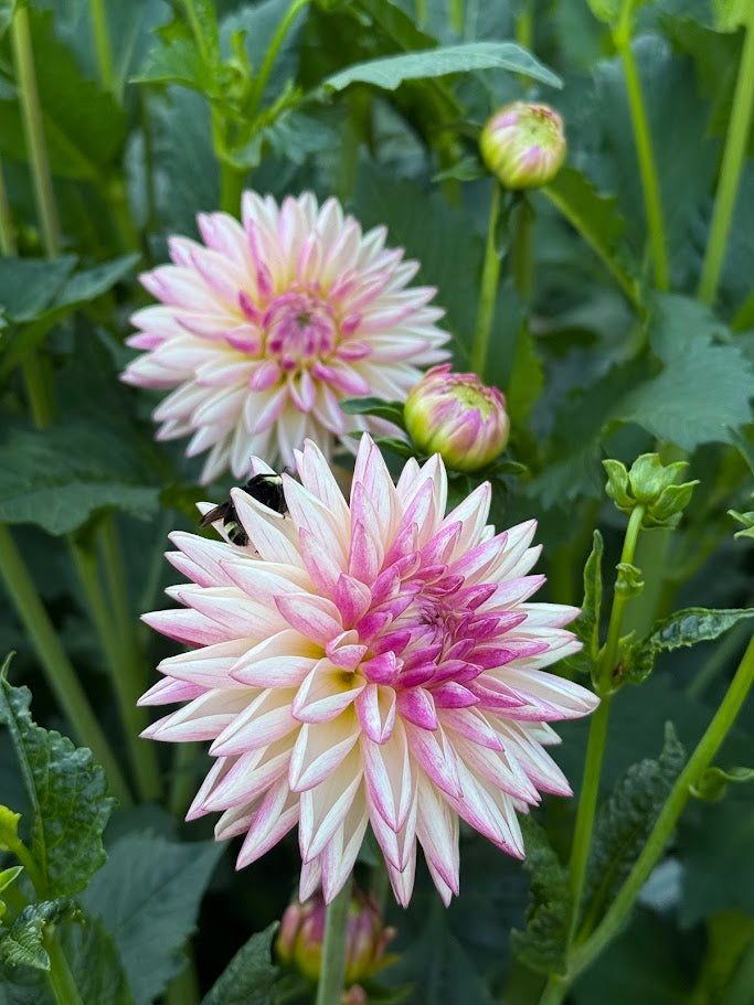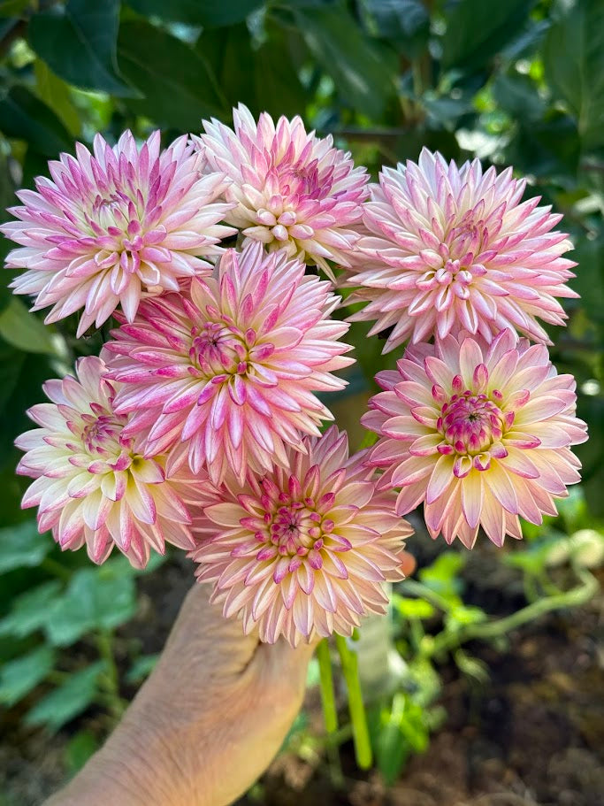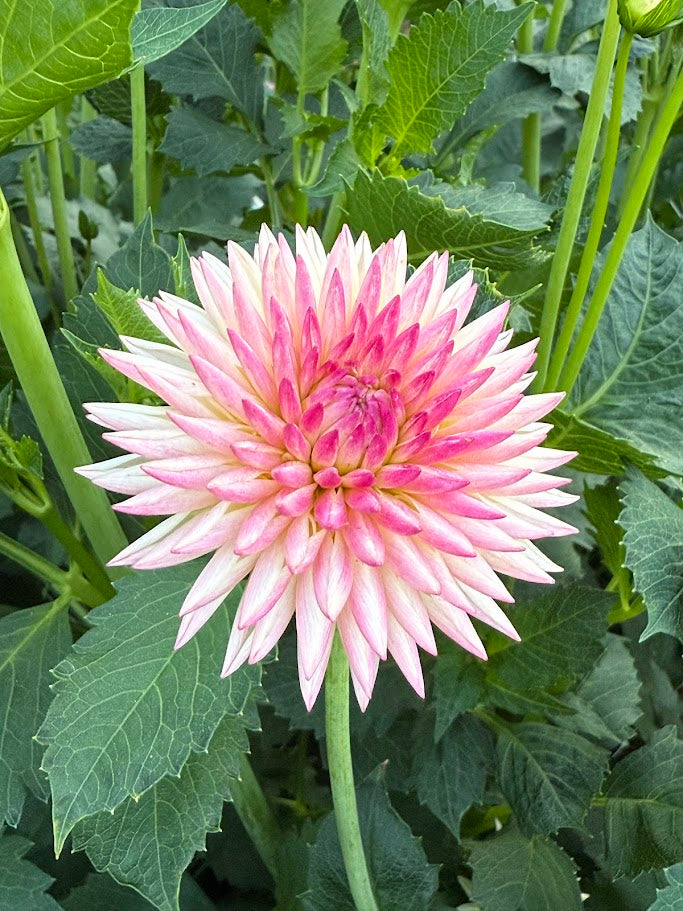 Dahlia 'Valley Porcupine' is a charming and highly unique novelty-form variety that is a favorite for both gardens and cutting patches. Its 2 to 4-inch blooms feature a delightful palette of creamy blush or silvery pink petals with striking fuchsia or dark pink tips. The petals elegantly roll inward, forming a distinctive, spiky, porcupine-like appearance. This prolific bloomer grows on strong, reliable stems to a height of 3 to 4 feet, making it an excellent cut flower and a fantastic choice for beginners.
